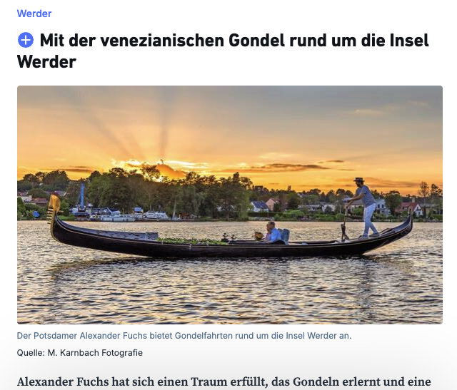 Unsere Gondel begeistert nicht nur auf dem Wasser, sondern ist auch ein gefragtes Motiv für Film und Fernsehen. Entdecke hier eine Auswahl an Reportagen und TV-Beiträgen über Alexander Fuchs und die traditionelle Kunst des venezianischen Ruderns in Berlin und Brandenburg.